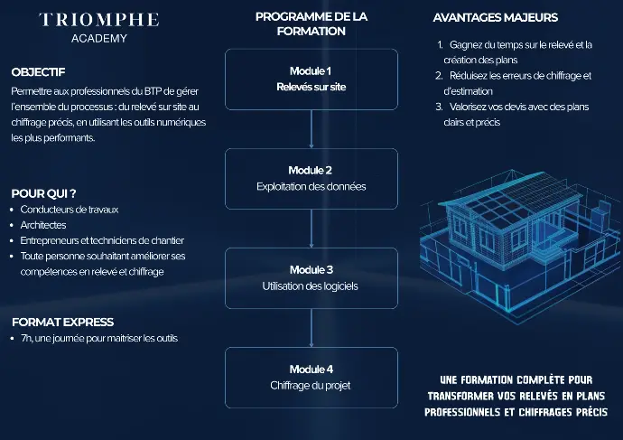 Cette journée de formation vous initiera à l’utilisation du Scan 3D pour réaliser rapidement des relevés précis, générer des plans d’architecte instantanés et obtenir des métrés fiables pour vos chiffrages. Accessible même aux débutants, cette session vous permettra de comprendre le fonctionnement du scan, son paramétrage, et ses meilleures pratiques sur le terrain. Entre théorie simple et exercices pratiques, vous apprendrez à exploiter cet outil devenu indispensable pour les professionnels de l’immobilier, du BTP et tous ceux qui souhaitent gagner du temps, sécuriser leurs projets et améliorer la précision de leurs analyses.