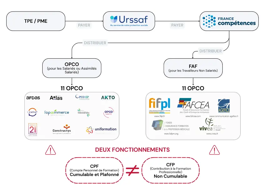 Chaque TPE, PME ou travailleur indépendant verse des cotisations à l’URSSAF, qui les transfère à France Compétences. Cet organisme redistribue ensuite les fonds à des OPCO (pour les salariés) ou FAF (pour les indépendants).